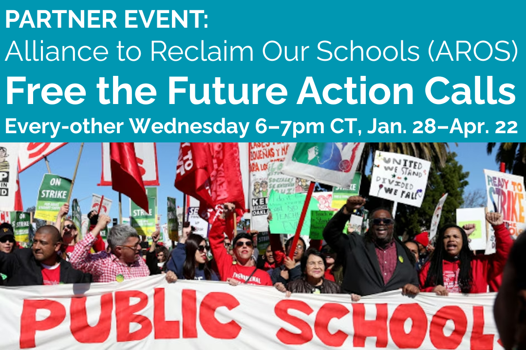 Join the Alliance to Reclaim Our Schools (AROS) for Free the Future biweekly action calls that build a national community of public ed supporters to learn about the attacks on public schools and share a weekly tactic we can use to defend public schools leading up to mass mobilizations on May Day.