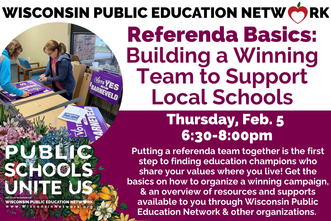 Putting a referenda team together is the first step to finding education champions who share your values where you live! Get the basics on how to organize a winning campaign, and an overview of resources and supports available to you through Wisconsin Public Education Network and other organizations.